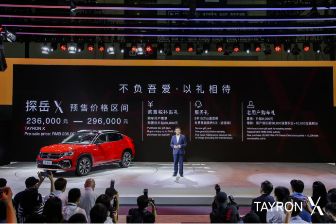 当天,一汽-大众品牌首款Coupe风格SUV探岳X (配置|询价)在此完成全球首秀,并正式开启预售,新车共四款车型,预售价格区间为23.6-29.6万元。