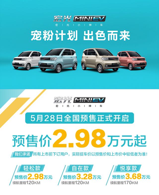 紧接着,宏光MINI EV在5月28日正式开启了预售,预售价2.98万元起,顶配只要3.68万元,不到24小时宏光MINI EV的订单量达到1658辆,相当于平均每分钟订出1.2辆。