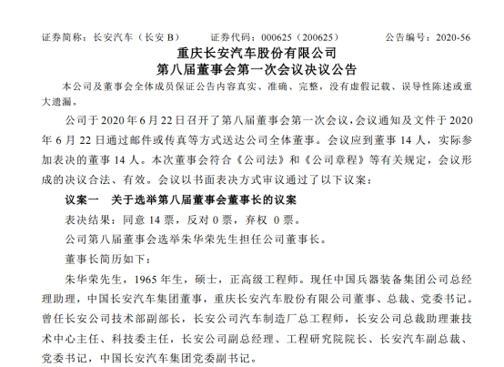6月22日晚间,重庆长安汽车股份有限公司(简称:长安汽车)发布公告表示,公司于6月22日召开了第八届董事会第一次会议,会议决议选举朱华荣担任公司董事长。至此,长安汽车换帅事宜尘埃落定!
