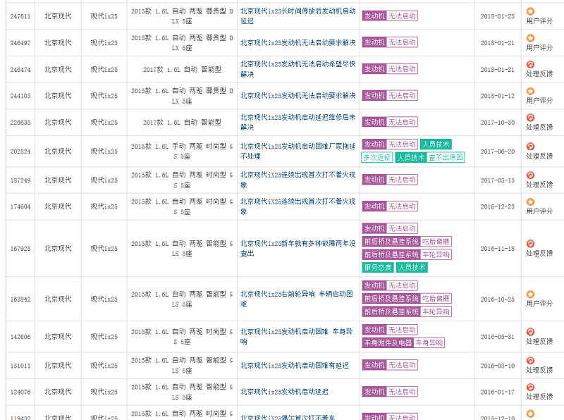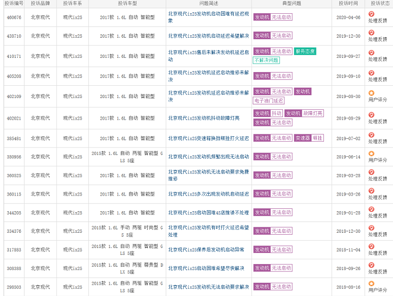 日前,我们从车质网了解到,北京现代ix25有大量消费者投诉发动机存在故障,经常性打不着火无法启动,而车型更是包括2015款、2016款、2017款多个年款车型,据投诉消费者描述,甚至有些新车ix25就出现了发动机启动困难的问题。
