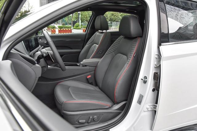 座椅采用真皮包裹,造型比较宽大,内部的填充物也很柔软,四周还有红色缝线处理,提升了运动化的观感,并且还有座椅加热和通风功能,副驾驶还有老板键。