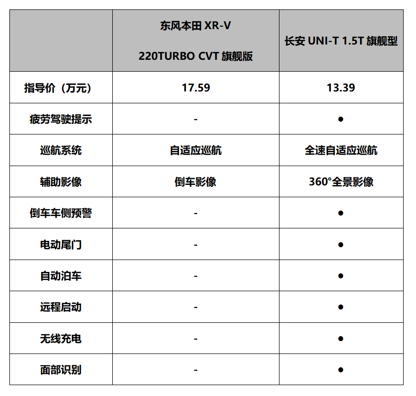两款车我们均选择顶配车型,东风本田XR-V 220TURBO CVT旗舰版指导价17.59万元;长安UNI-T 1.5T旗舰型指导价13.39万元,价格相差4.2万元,但配置反而UNI-T更高。不仅拥有全速自适应巡航、360°全景影像、远程启动、倒车车侧预警,能大幅度提升行车安全性,还配备有AI面部识别、inCall车辆远程控制系统等等,这些只是冰山一角。