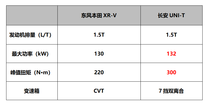 长安UNI-T和东风本田XR-V配备的都是1.5T发动机,但账面数据却相差甚远。长安UNI-T最大功率132kW,峰值扭矩达到了300N·m,匹配一台7挡双离合变速箱;东风本田XR-V最大功率310kW,峰值扭矩220N·m,搭配的是CVT变速箱,虽然并不弱,但与长安UNI-T相比明显不在一个“量级”。