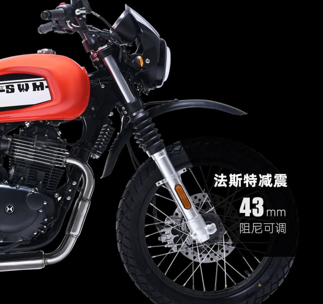 虽然SIX DAYS 500定位于Scrambler风格,但主要用途还是公路,同时具备有限的越野能力,为此鑫源配置了通用型车架。SIX DAYS 500采用了高张力钢管摇篮车架,将470cc的大单缸紧紧拥抱,以增强整体刚性。悬挂系统方面,前轮安装的是法斯特43mm长行程前叉,后部匹配的是双筒减震器,在满足公路驾驶的同时,能较好地消化砂土路面的颠簸;最小离地间隙达到180mm,具备较强的通过能力,普通坑洼路段轻松应对。