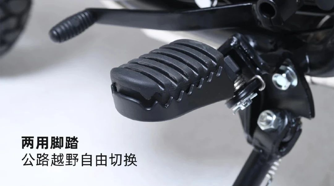 车轮采用了钢丝辐条结构,匹配了两用轮胎(非真空胎),再加上较大直径的前轮,增强了通行土路、荒地等越野时的稳定性。脚踏同样贯彻了两用思路,公路行驶时配上橡胶减震块,增加乘骑舒适度;越野行驶时又可以取下,防止通行泥泞路段时脚踏打滑。