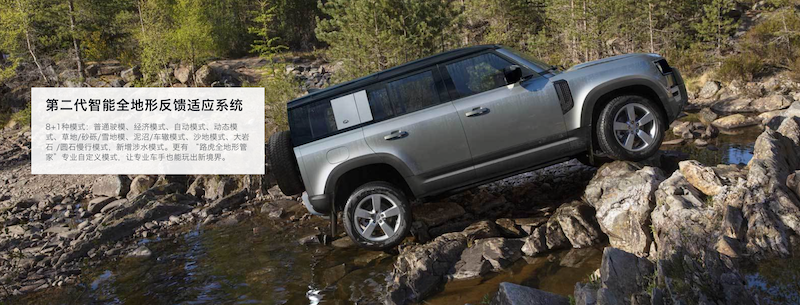 1、第二代智能全地形反馈适应系统最多可提供9种模式选择(8种地形及驾驶模式+1种涉水模式),包括自动模式、舒适驾驶模式、草地/碎石地/雪地模式、泥泞地面/车辙地模式、沙地模式、岩石爬行模式、节能模式,以及新增的涉水模式。