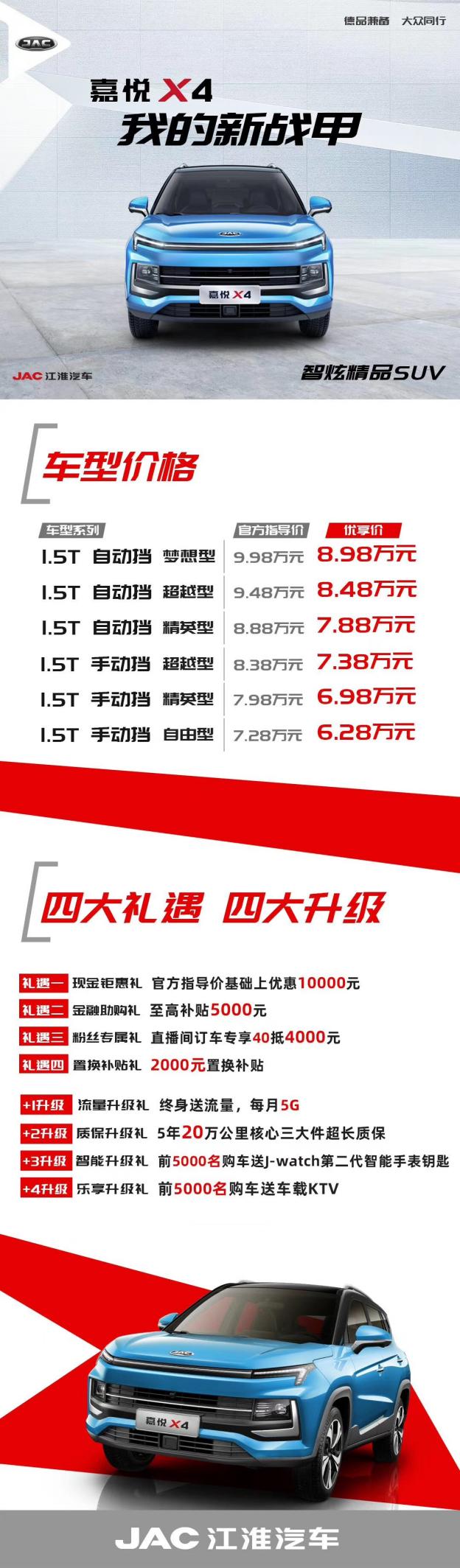 6月27日,江淮嘉悦X4以线上发布会的形式正式上市,售价6.28-8.98万元,江淮嘉悦X4是江淮乘用车3.0时代的首款小型SUV,搭载1.5T动力,变速箱方面匹配6MT/CVT。