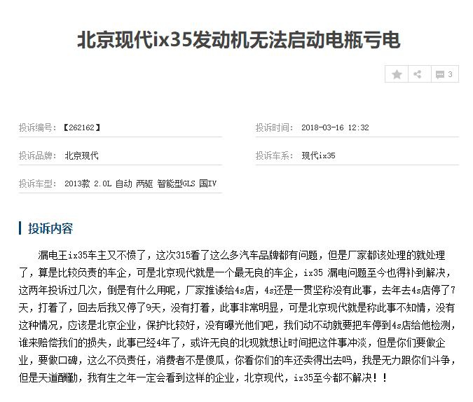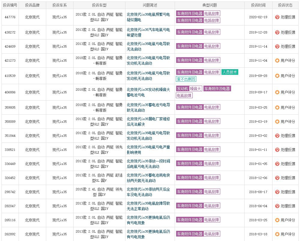 目前,我们从车质网了解到2013款北京现代ix35遭大量客户投诉,其电瓶故障为首,发动机异响、发动机拉缸、发动机无法启动等故障频繁爆出,多数投诉为汽车电瓶故障。