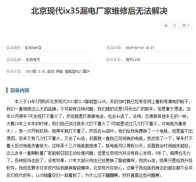 北京现代前两年可谓,鱼龙得水 活气涛涛 家喻户晓 人人皆知,可现如今既是鲤鱼跃龙门又是坠落深渊低谷。根据车质网了解到ix35 (配置|询价)屡遭客户投诉,原因则是汽车漏电情况严重,无法启动车辆,更为严重的是,有车主表示5年时间未被修好,对北京现代失望透顶。