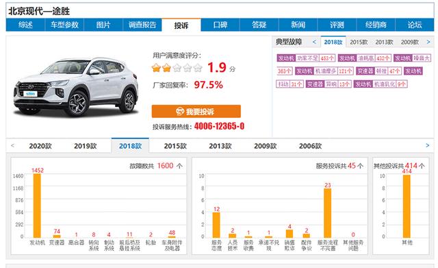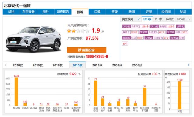 以北京现代途胜 (配置|询价)为例,我们从车质网可以发现,途胜2018款车型与2015款车型投诉最多,分别为1600个和5322个。投诉问题如下:发动机机油增多、异响、抖动、变速箱异响、顿挫等。
