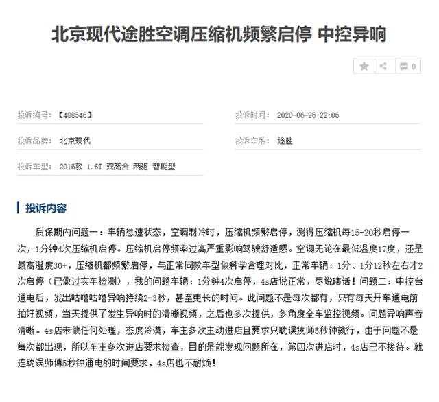 此外还有车主投诉2015款1.6T双离合两驱智能型途胜空调压缩机频繁启停和中控异响,质保期内问题一:车辆怠速状态,空调制冷时,压缩机频繁启停,测得压缩机每15-20秒启停一次,1分钟4次压缩机启停。压缩机启停频率过高严重影响驾驶舒适感。空调无论在最低温度17度,还是最高温度30+,压缩机都频繁启停,与正常同款车型做科学合理对比,正常车辆:1分、1分12秒左右才2次启停(已做过实车检测),我的问题车辆:1分钟4次启停,4s店说正常,尽说瞎话!问题二:中控台通电后,发出咕噜咕噜异响持续2-3秒,甚至更长的时间。此问题不是每次都有,只有每天开车通电前拍好视频,当天提供了发生异响时的清晰视频,之后也多次提供,多角度全车监控视频。问题异响声音清晰。4s店未做任何处理,态度冷漠。