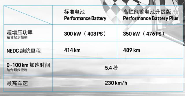 保时捷 Taycan 配备标准电池版本NEDC续航里程为414 km,而配备高性能蓄电池升级版Performance Battery Plus 时的 NEDC 续航里程为489 km。