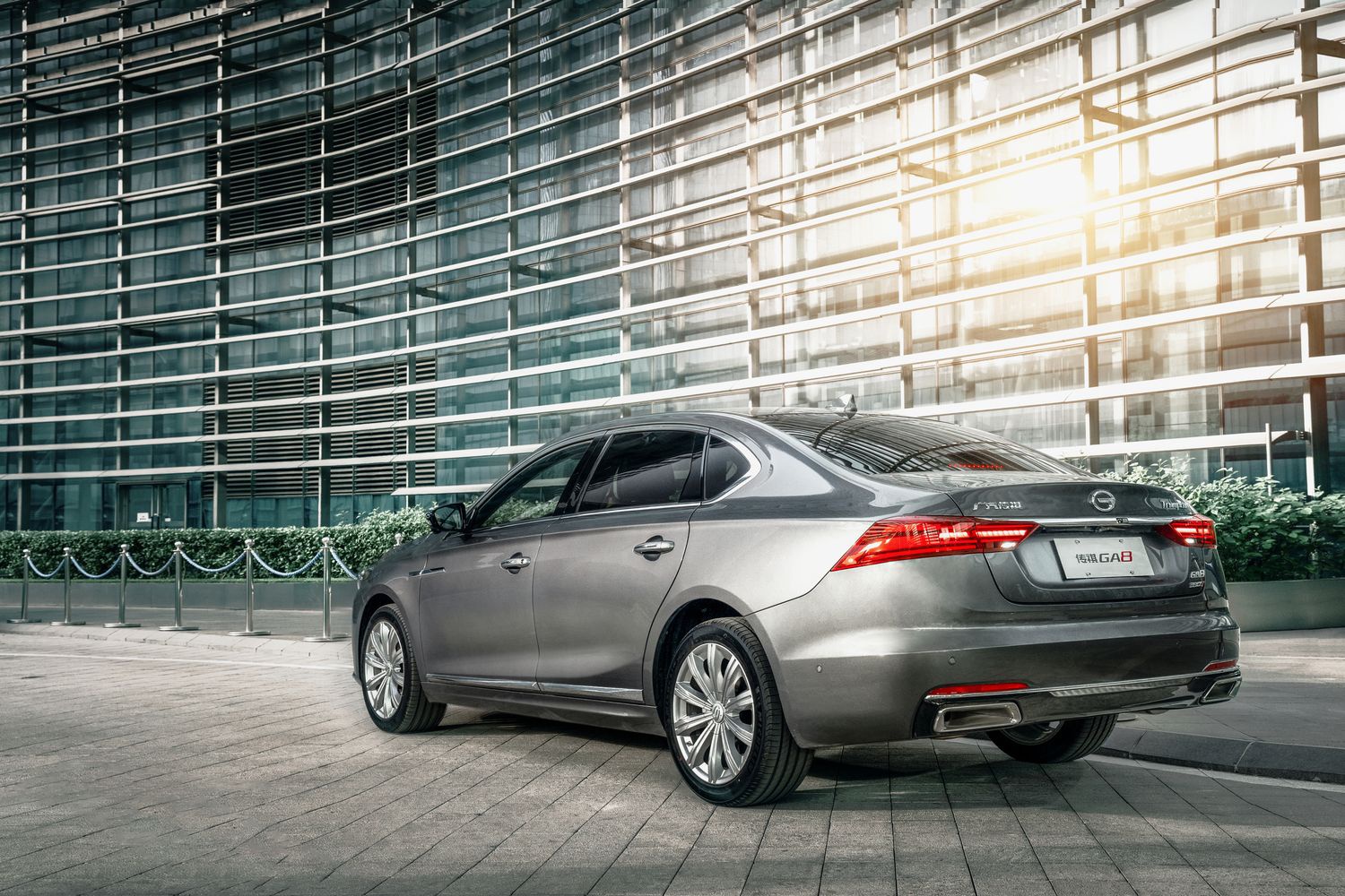 车尾部,全新传祺GA8给人的感觉相对来说比较沉稳,狭长的分体式尾灯通过一条镀铬装饰条所相连,下方双边共两出的矩形排气,给车尾带来了一定的档次感。