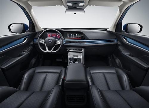 CS55纯电版内饰部分与长安CS55 PLUS基本一致,中控台线条简约流畅,10英寸全液晶仪表盘与10.25中控触摸屏相连,富有科技感。中控面板与车门饰板也加入了象征新能源的蓝色配色。