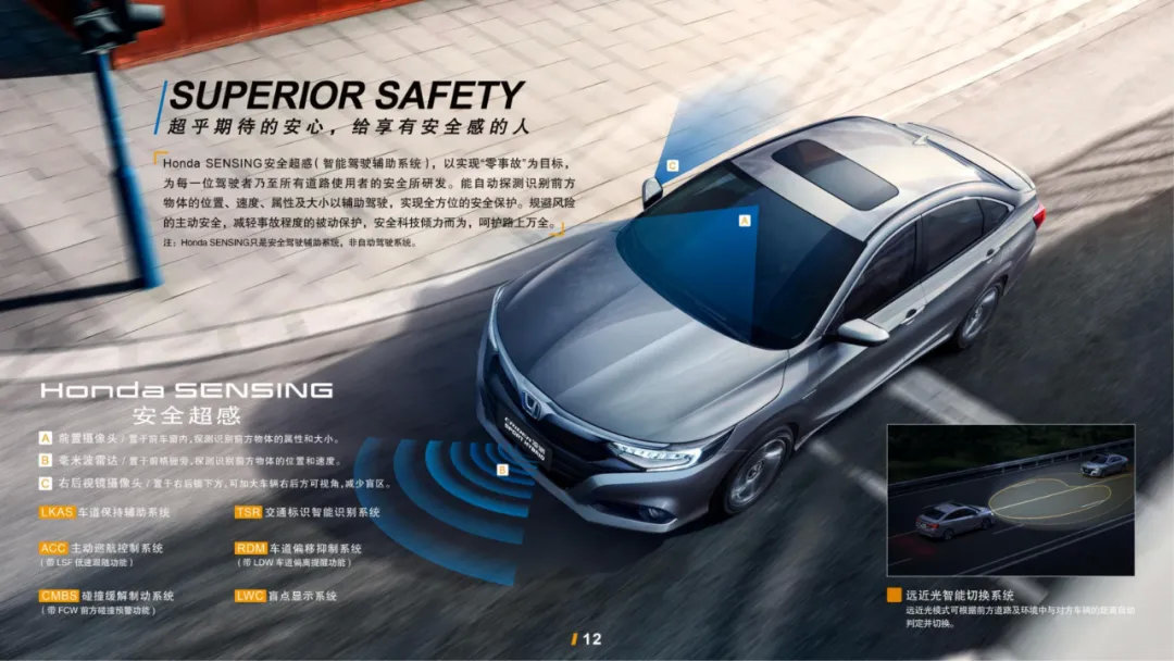 而在顶配以及次顶配车型中,还搭载了HondaSENSING主动安全系统,这套系统通过前置摄像头、毫米波雷达、右后视镜摄像头共同组成,能够实现主动车道保持辅助、自动跟车巡航、防碰撞预警、交通标识识别、盲点检测、自适应远近光灯等功能。