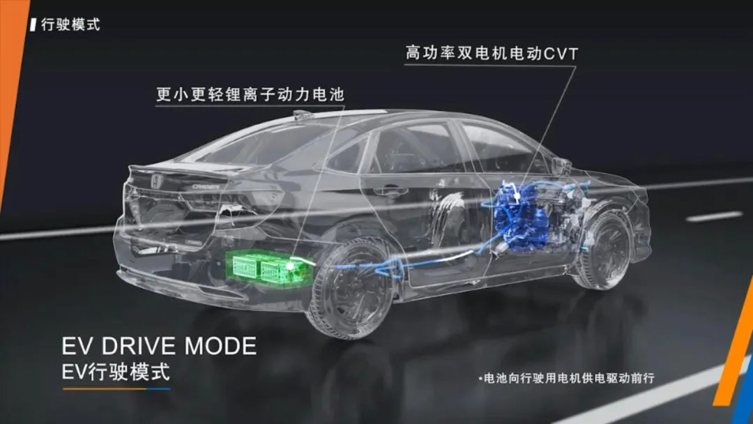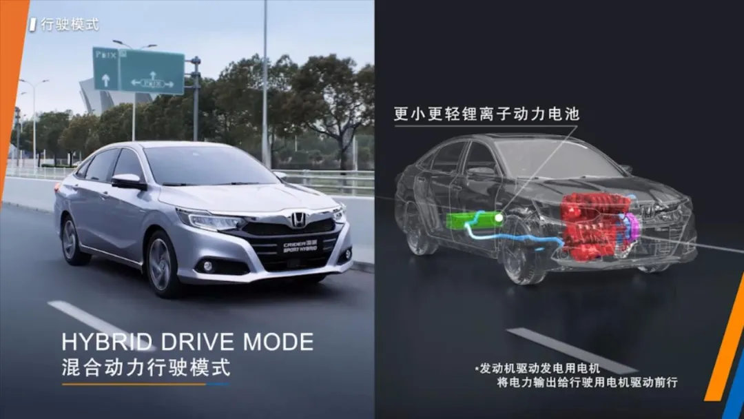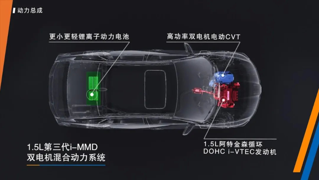 既然是全新的混动车型,那它最大的亮点当然是动力系统了。凌派锐·混动使用了本田第3代i-MMD混动系统,是目前本田在国内价格最低、技术最新的混动系统。从整体结构上看,i-MMD系统由一台1.5L自然吸气发动机、发电机、驱动电机、E-CVT变速机构以及锂离子动力电池组成,结构虽然简单,但是最终实现的效果可是非常出色的。