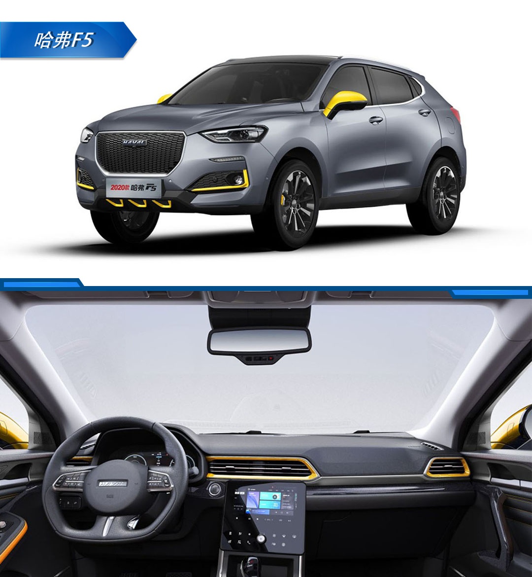 就三款车设计来看,哈弗F5在设计感和配色上让人眼前一亮,溜背式车身和饱满的线条设计,熏黑的进气格栅更彰显了整车的高级感,整车灰色的车身夹杂着黄色作为点缀,内饰也同样采用黑黄拼接,套色设计确实很新潮,也符合年轻人审美。