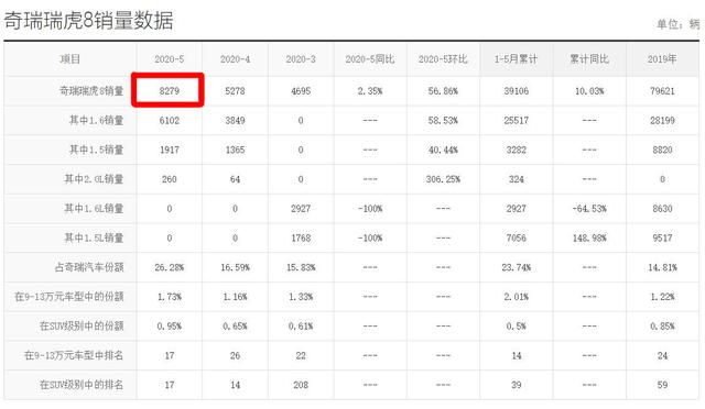 这款车它就是奇瑞汽车旗下的瑞虎8 (配置|询价)。说到瑞虎8,其实5月销量表现还是非常不错的,新车一共卖出了8279台,相比4月的5278台继续销量大涨,由此可见该车不错的产品实力。