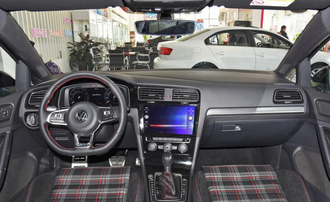 大众车型在内饰方面,即使是高尔夫GTI,也一贯采取相对保守的方式,没有太多惊喜存在。其内饰仅在细节上与普通版高尔夫区分开,带有红色缝线的平底方向盘和苏格兰格子布座椅是这款车最大亮点。