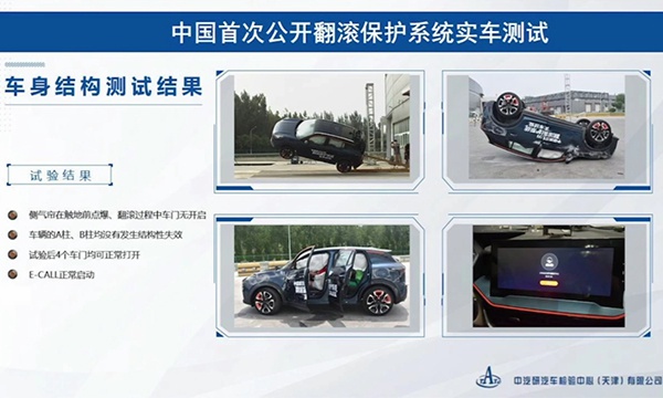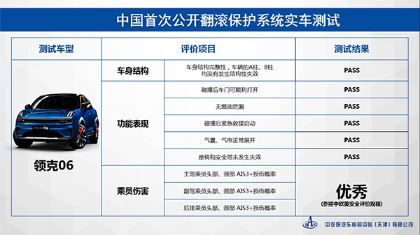 活动当场也是中国首次翻滚保护系统实车测试,据天津中汽研试验室的画面显示,领克06从发射区沿一条跑道从0加速至50 Km/h,随后单侧车轮骑上单边桥壁障,凌空翻滚再落地。最终凭借超过与中汽研最初设定的“单侧门开启”合格标准,其交出双侧四门均能开启的优异成绩。