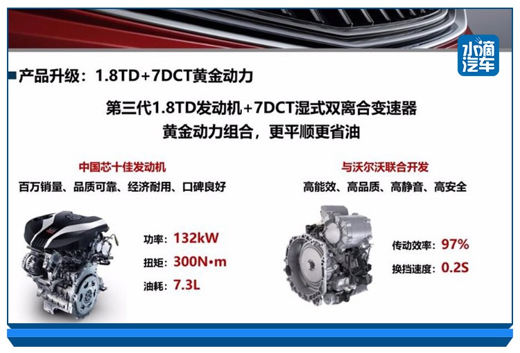 新款车型将搭载1.8T引擎,最大功率为132千瓦,峰值扭矩为300牛·米,并取消此前的6速手自一体变速箱,换搭最新的7速湿式双离合变速箱,百公里油耗为7.3升。此外,作为改款车型配置还将得到进一步升级,但详细情况还未知,有关新车的其他信息,水滴汽车APP将持续进行关注。
