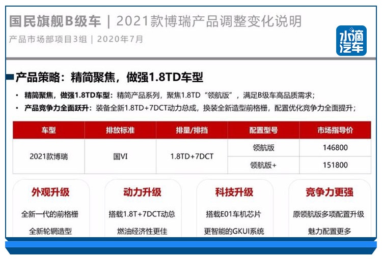 7月6日,水滴汽车APP从网络获悉了一组2021款吉利博瑞的产品信息,相比现款车型其在多方面均作出提升,进一步增强了竞争力。