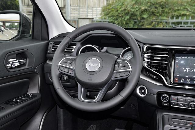 三辐式多功能方向盘采用Jeep家族式设计风格,造型变化不大,握感扎实。