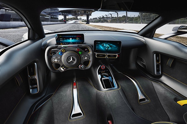 在车厢内部,设计师们也很好地平衡了赛事及民用的需求界限;能够从大块的碳纤维面板、尼龙门把手以及简洁的车厢内部看得出来,AMG One为了轻量化做了非常多的工作;除此之外,方向盘也换成了方形设计,座椅也随之更滑屋内了桶椅设计,战斗感满满。在这些之外,AMG One还保留了双液晶屏的设计,档次感非常出色;在座椅、门两侧以及换挡区域部分也看到了非常多镀铬及钢琴烤漆的运用,可谓是战斗中不失典雅。