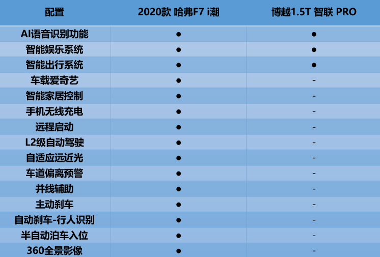 哈弗F7和吉利博越PRO均是各自品牌的热门SUV车型,在市场上有着较高人气,而在决定车辆智能化程度方面,两款车同样有着不俗的表现,支持语音交互、海量娱乐服务以及在线智能导航等服务。但相比吉利博越PRO较为常规的智能化配置,哈弗F7还可提供L2级自动驾驶、远程启动、车载爱奇艺以及智能家居控制等服务,无疑更加具有未来气息。