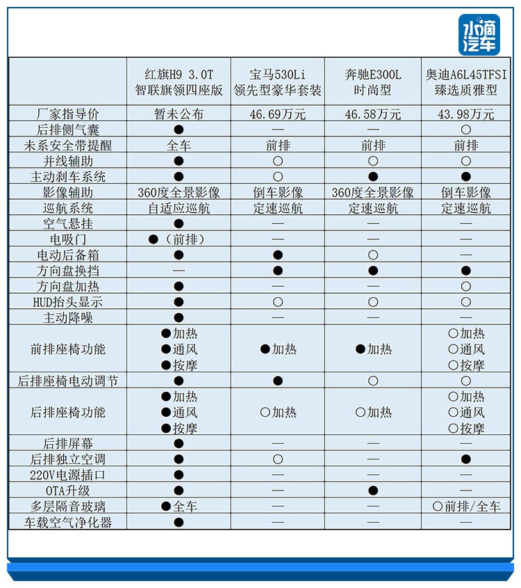 目前,红旗仅公布了H9顶配车型3.0T智联旗领版四座版的配置单,值得一提的是,这款车型标配了后排侧气囊以及全车的未系安全带提醒,这是奔驰E级、宝马5系和奥迪A6L都未配备的,由此可见红旗对于后排乘客的安全性同样十分重视。