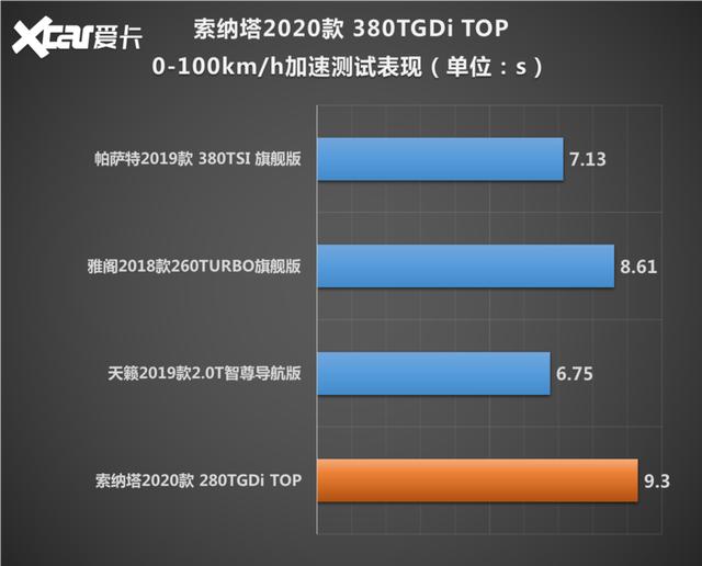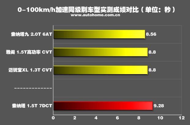 什么概念?要知道,配备1.5T+CVT动力组合的本田雅阁其0-100km/h加速成绩是8.61秒,帕萨特2.0T车型的0-100km/h加速成绩为7.13秒,搭载最新2.0T可变压缩比发动机日产新天籁,0-100km/h加速成绩更是达到了6.75秒,所以十代索纳塔要论加速,这2.0T机头我觉得真心没啥吸引之处。