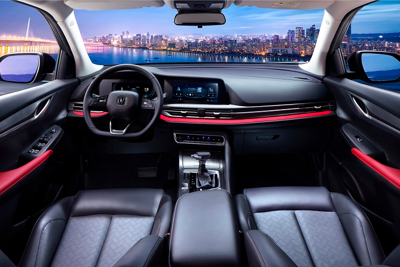 内饰设计方面,全新CS55PLUS蓝鲸版提供了两种内饰风格,一种是一体化的“烟熏黑”配色,呈现简约大气的风格,第二种则是“激烈红”配色,该配色方案在前者的基础上辅以一道贯穿式的红色饰条,红黑撞色的搭配形成强烈的视觉冲击感。另外,在科技感营造方面,新车配备了1920*720分辨率的10.25英寸的高清屏幕,配合上全液晶仪表,形成双屏联动的视觉效果,不仅显示信息更丰富,而且视觉效果也更加形象。