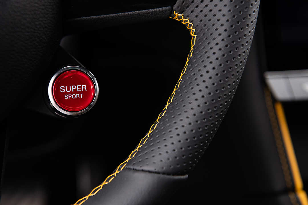 多功能方向盘的右下角上设置有一个红色的Super Sport超级运动模式按键,在该模式下,12.3英寸的液晶仪表和中控屏都可以显示出专属的车辆性能参数信息显示界面,涵盖G值、功率、扭矩、油温、压力等等。