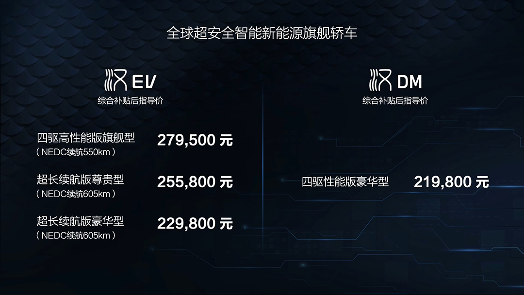 7月12日晚,比亚迪汉 正式上市,新车推出DM插混版和EV纯电版共计4款车型,补贴后售价区间为21.98万-27.95万元。其中,DM插混版有1款,补贴后售价为21.98万元;EV纯电版有3款,补贴后售价区间为22.98万-27.95万元。