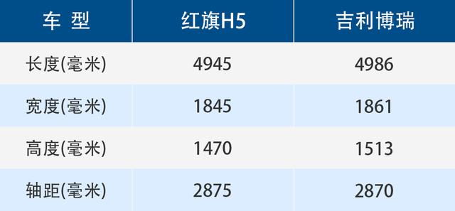 与同为主流自主品牌的吉利博瑞相比,红旗H5在长宽高上并没有占据优势,但轴距要更长,乘坐空间方面预计表现会更优秀。同时造型气场上,红旗H5要更强。