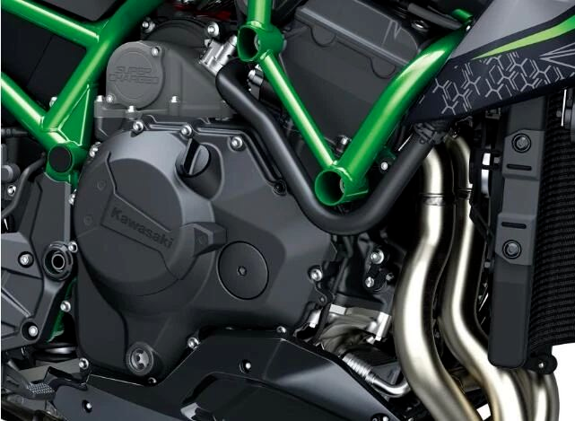 Z H2搭载了液冷、DOHC 16气门的直列四缸发动机,排量为998cc,经由机械增压后,进气压力进一步提高,在相同时间内压入更多的气体,爆发更多的能量!需要指出的是,这颗动力心脏叫做“第二代平衡机械增压发动机”,并非原原本本地从Ninja H2上搬过来。由于定位不同,Z H2定位于街车,着眼于公路需求,因此尽管直列四缸外形依然如故,但是内部已经作了深度调节,齿轮比也作了修改。结果,Z H2在维持高输出动力之外,强化了中低转速范围内动力线性输出,易于骑手精准掌控。