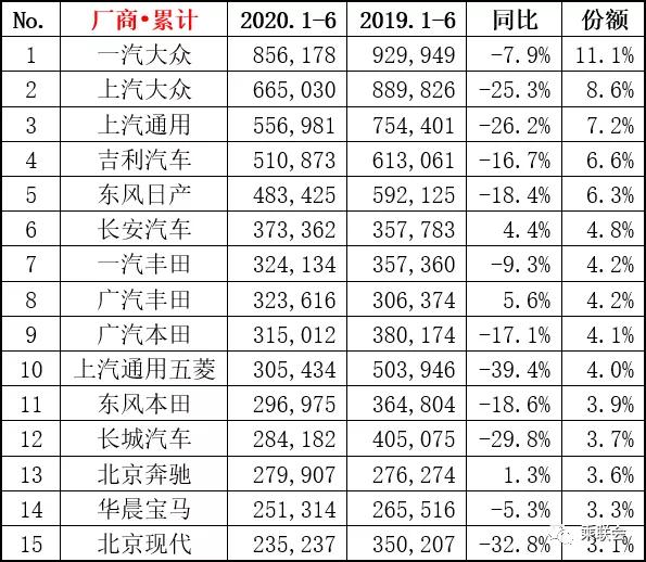 6月份国内汽车市场销量数据已经出炉,乘用车市场销量达166.1万辆,同比下降5.9%,环比增长3.3%,上半年累计销量为771.2万辆,同比下降22.5%。