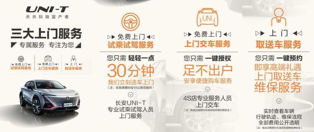 还有一点值得多提一下,就是长安汽车目前推出了三大上门服务。消费者通过长安引力APP除了可以详细了解到UNI-T的售价、各项信息参数和在线订车外,还可享受"上门试乘试驾"、"上门交车"、"上门取送车",三大上门服务。