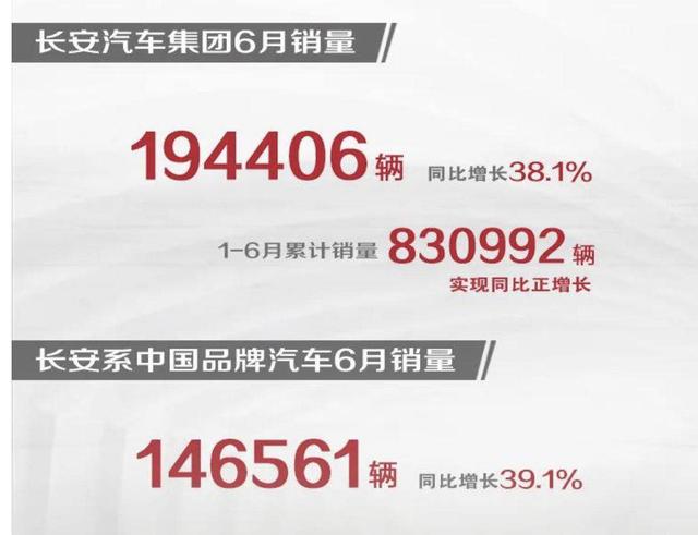 据数据显示,长安汽车集团6月销量为194406辆,同比增长38.1%,其中长安系中国品牌汽车6月销量146561辆,同比增长39.1%。截至今年上半年,1-6月累计销量达830992辆,实现同比正增长。