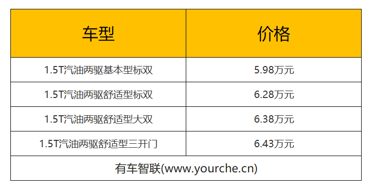 动力方面,新车将搭载一台1.5T涡轮增压发动机,最大功率为162马力,峰值扭矩为230牛·米。传动系统方面,与发动机匹配一台5速手动变速箱。满足国六排放标准。