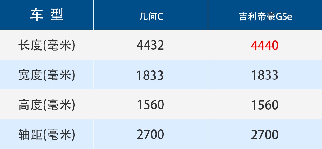 在车身尺寸上,几何C更是做到了复刻,除了可能因为车头车尾造型细微差别短出的8毫米,你可以理解为这几乎就是一台帝豪GSe的改装车。