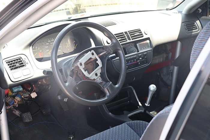 就像很多人说的一样,希望越大、失望越大。虽然这辆EK9的外观几乎达到了无可挑剔的完美地步,但整车依然处于“半成品”状态。一进到车内,主副驾驶区凌乱的线束、几乎被拆空的空调面板、纵横交错的防滚架以及气囊部分被拆空的方向盘都会让你产生一种难以掩饰的失落感,这真的是我刚才看到的那辆极品车况EK9?