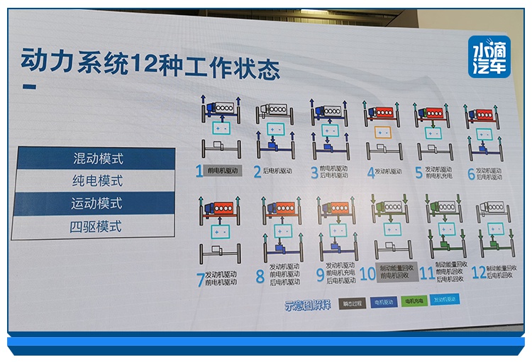 最终天逸PHEV的动力系统有4种模式(混动模式、纯电模式、运动模式和四驱模式)和12种工作状态(前电机驱动、后电机驱动、前后电机共同驱动、发动机驱动、发动机驱动前电机充电、发动机驱动后电机驱动、发动机驱动前电机驱动、发动机驱动前后电机驱动、发动机驱动前电机充电后电机驱动、制动能量回收、制动能量回收前电机回收后电机回收、制动能量回收后电机回收)