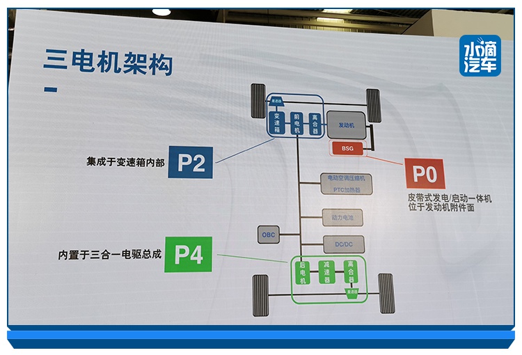 首先讲插电混结构复杂,一般而言,目前的插电混车型主要是两种结构的混动,而天逸PHEV采用了P0+P2+P4的布局形式。