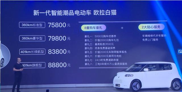 2020年7月15日,长城汽车旗下新能源品牌欧拉第三款新车——欧拉白猫正式上市,新车共推出NEDC综合工况360km和401km两种续航版本,补贴后售价7.58万-8.88万元。