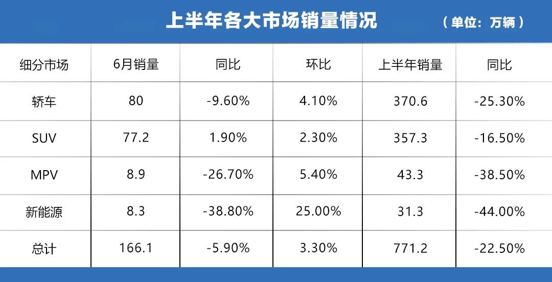 从车市大环境来看,由于受到疫情和车市环境下行的影响,各大细分市场都受到了较为明显的冲击。不过轿车、SUV、MPV和新能源乘用车四大市场在6月均出现了较为明显的环比增长。以长远的眼光来看,大部分主流车企的表现依然值得称赞。以下是各细分市场的具体销量和前十排名,轱辘哥接下来将分析其排名变化。