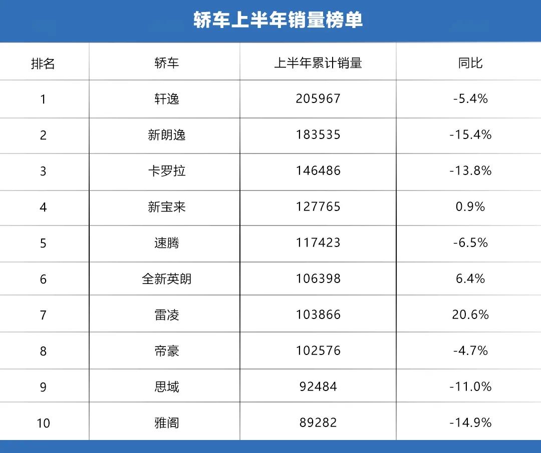 轿车市场前十名依然被日系和德系车型占领,同时前三名依然是轩逸、新朗逸和卡罗拉。从前十名数据来看,只有新宝来、全新英朗、雷凌三款车型的销量比去年同期高。