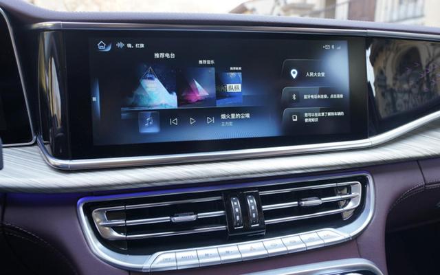 进入车内,红旗H9整体中控台造型显得很飘逸、很有层次感,同时中轴线的元素也依旧在车内整体布局上得以传承。配备的氛围灯采用了253色可调,配合中控台上个若隐若现的山水纹理,让它车内的氛围有别于同级别德系豪华车追求的科技与奢华,更多了一份属于东方、属于中国的含蓄与稳重。音响也带有主动降噪、虚拟环绕以及音源修复技术,还独创了国乐提示音和定制国宝级乐器演奏,相当高级。至于做工和皮料,在同级别中仍然可以说是名列前茅,完全不必担心。