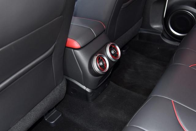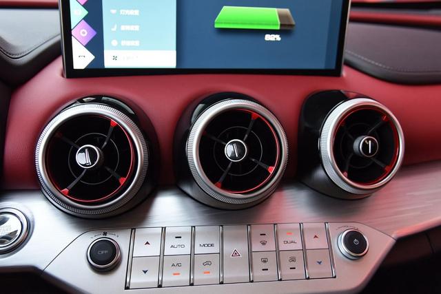 中控台正前方三个圆形的空调出风口,中间加入了红色元素,下面保留了实体的空调控制按键和多媒体系统音量旋钮。