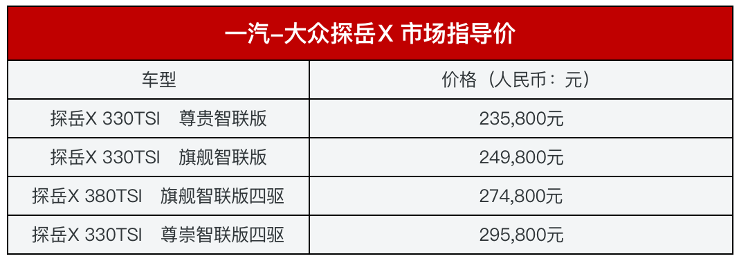 继上汽大众推出途昂X (配置|询价)之后,一汽大众也推出了自己的首款Coupe SUV——探岳X (配置|询价)。今晚,它在北京正式上市,共有四款车型,全部为2.0T版本(高低功率版),售价为23.58万-29.58万元。